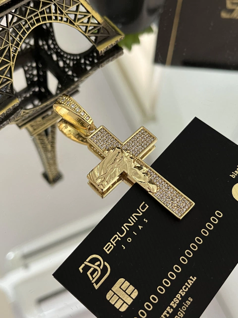 1 Pingente Cruz Face de Cristo Cravejada, mede 3,1 cm (L) x 4,6 cm (A), recomendamos para correntes médias e grossas, pesa aproximadamente 7 gramas.